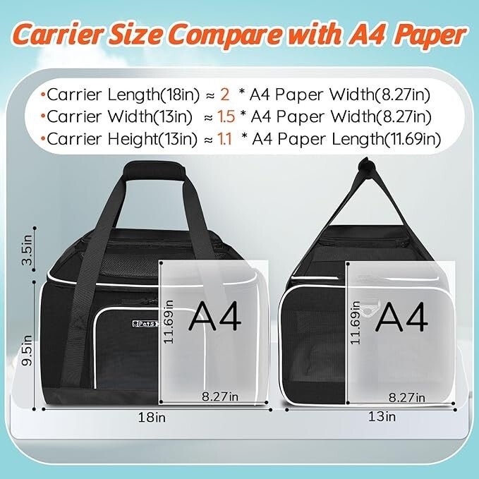 - AIRLINE APPROVED CARRIER 】Unfolded size:17"L×12"W×(8.5+3.5)"H, Petskd pet carrier is TSA approved and can be placed under the seat in the cabin(after remove the wheel base), it is mainly designed for ①JetBlue Airlines②Spirit Airlines③Frontier Airlines, but also in compliance with ④Allegiant Airlines⑤Southwest Airlines⑥Air Canada. We recommend you buy this carrier when you fly with the above-mentioned airlines.