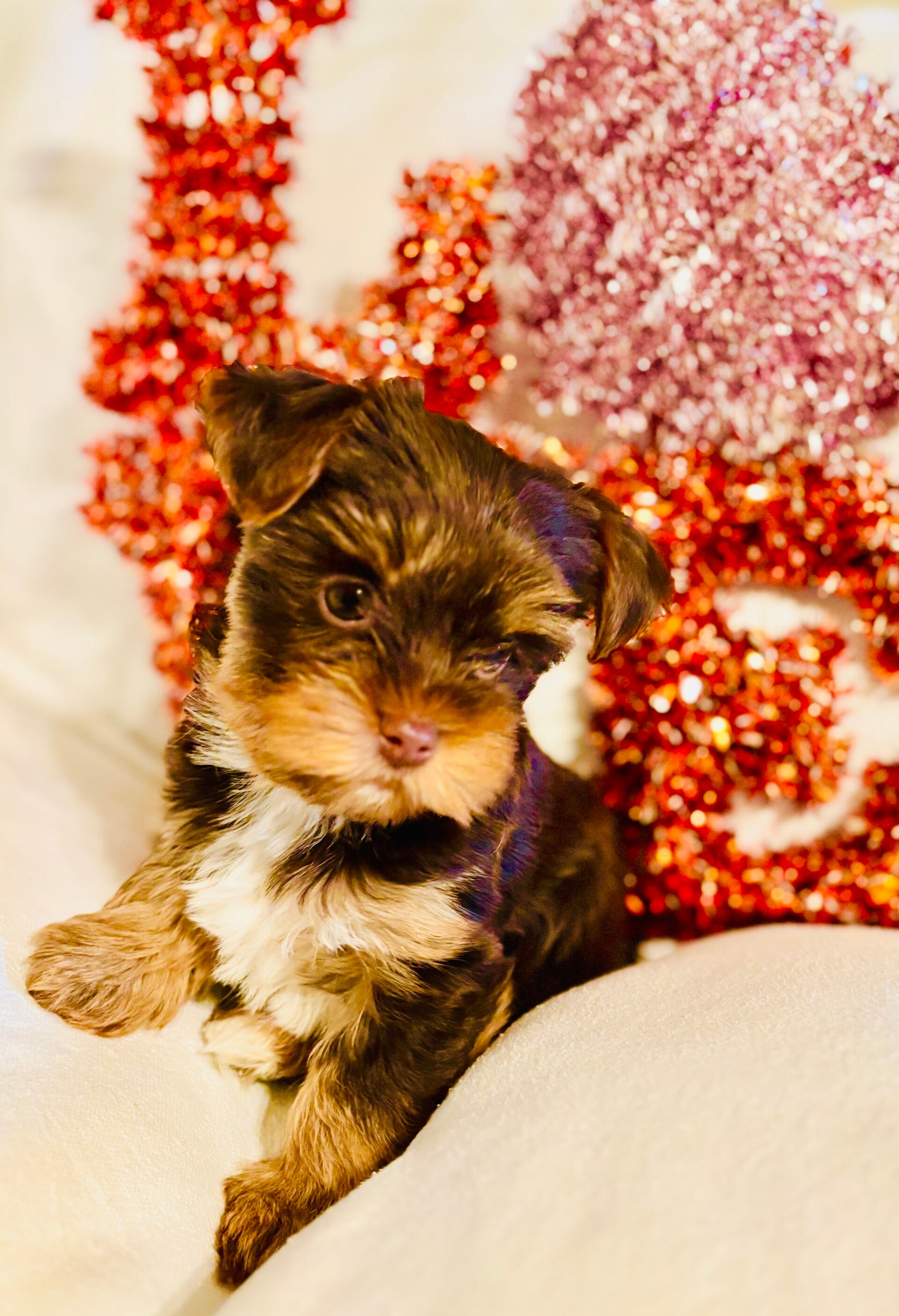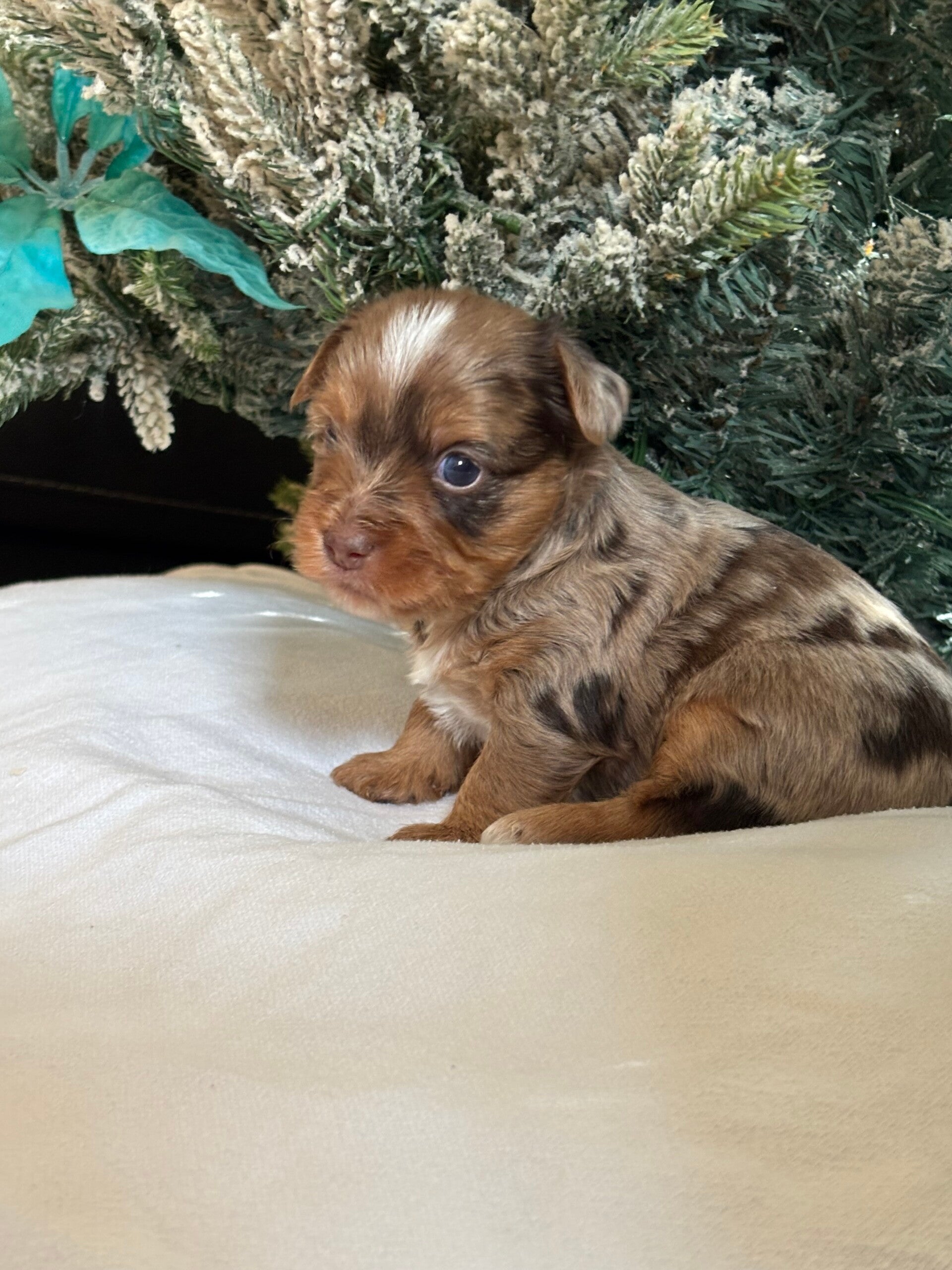 PRINCE- RARE EXOTIC CHOCLATE MERLE: 9lbs UNIQUE COLORS light brown (tan), chocolate brown patches, white crest line on head, white chest, hazel eyes. Fluffy Yorkshire terrier with silky hypoallergenic hair. Prince is the perfect little charmer! His playful energy and love for the cuddles make him irresistible companion. plus, his exotic eyes. It so much fun playing fetch with him-he's got the perfect mix of sweetness and spunk!