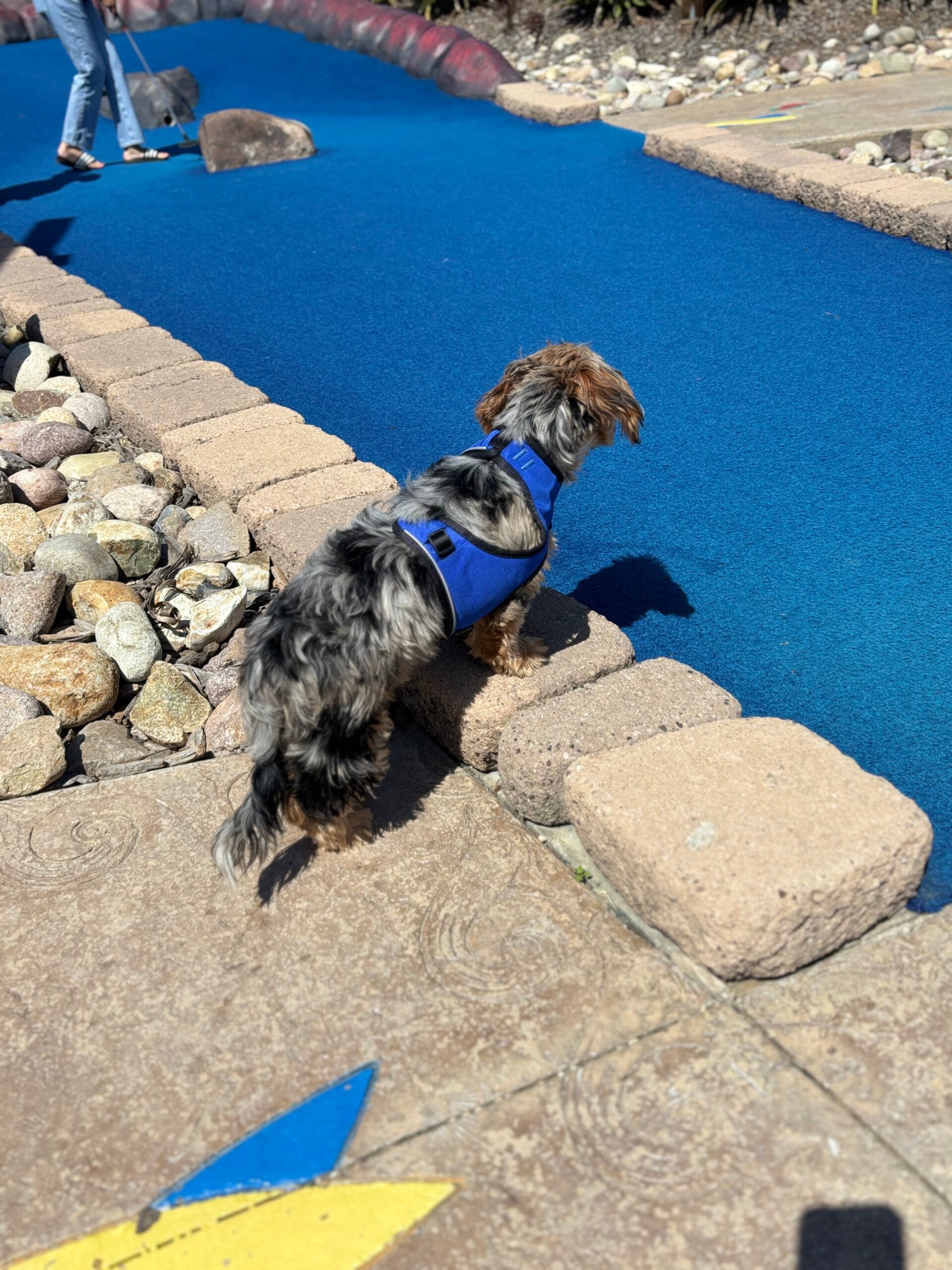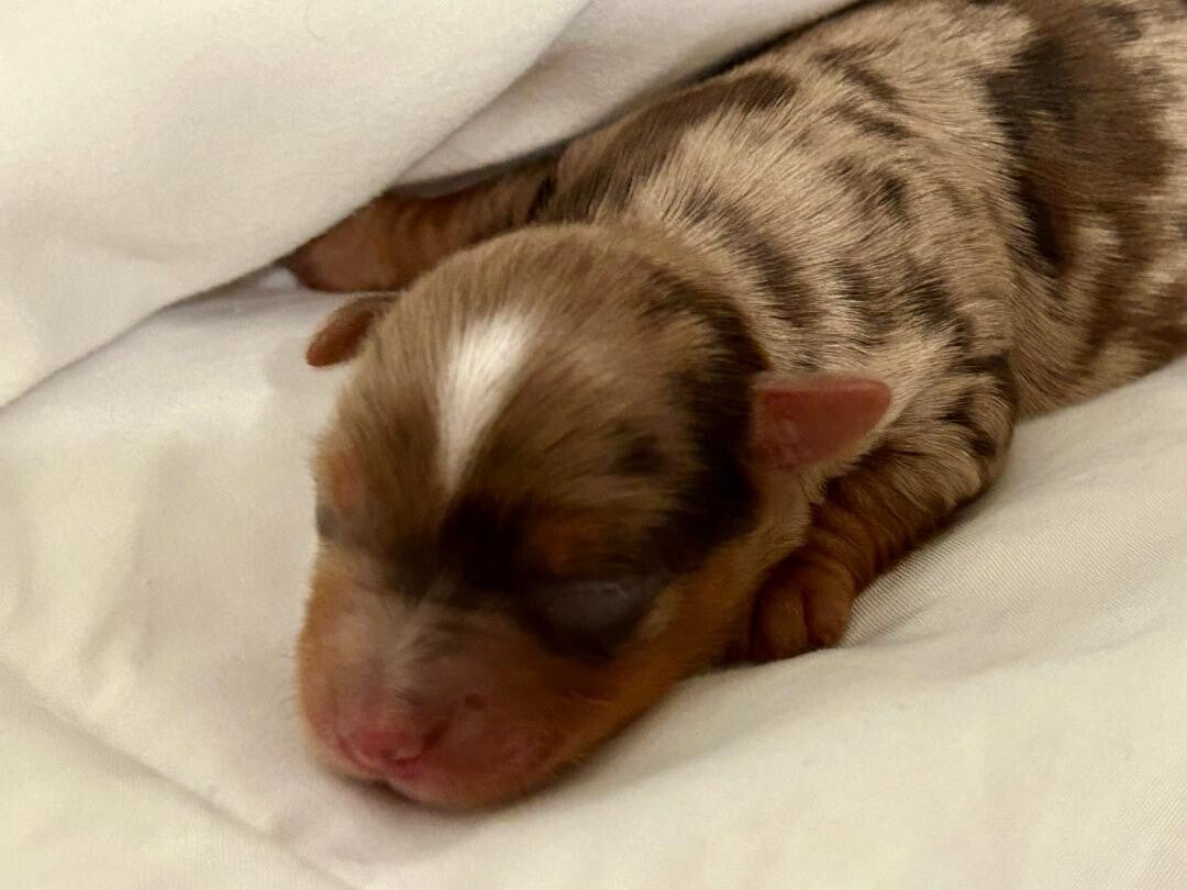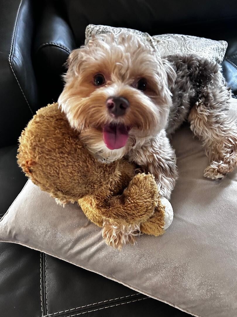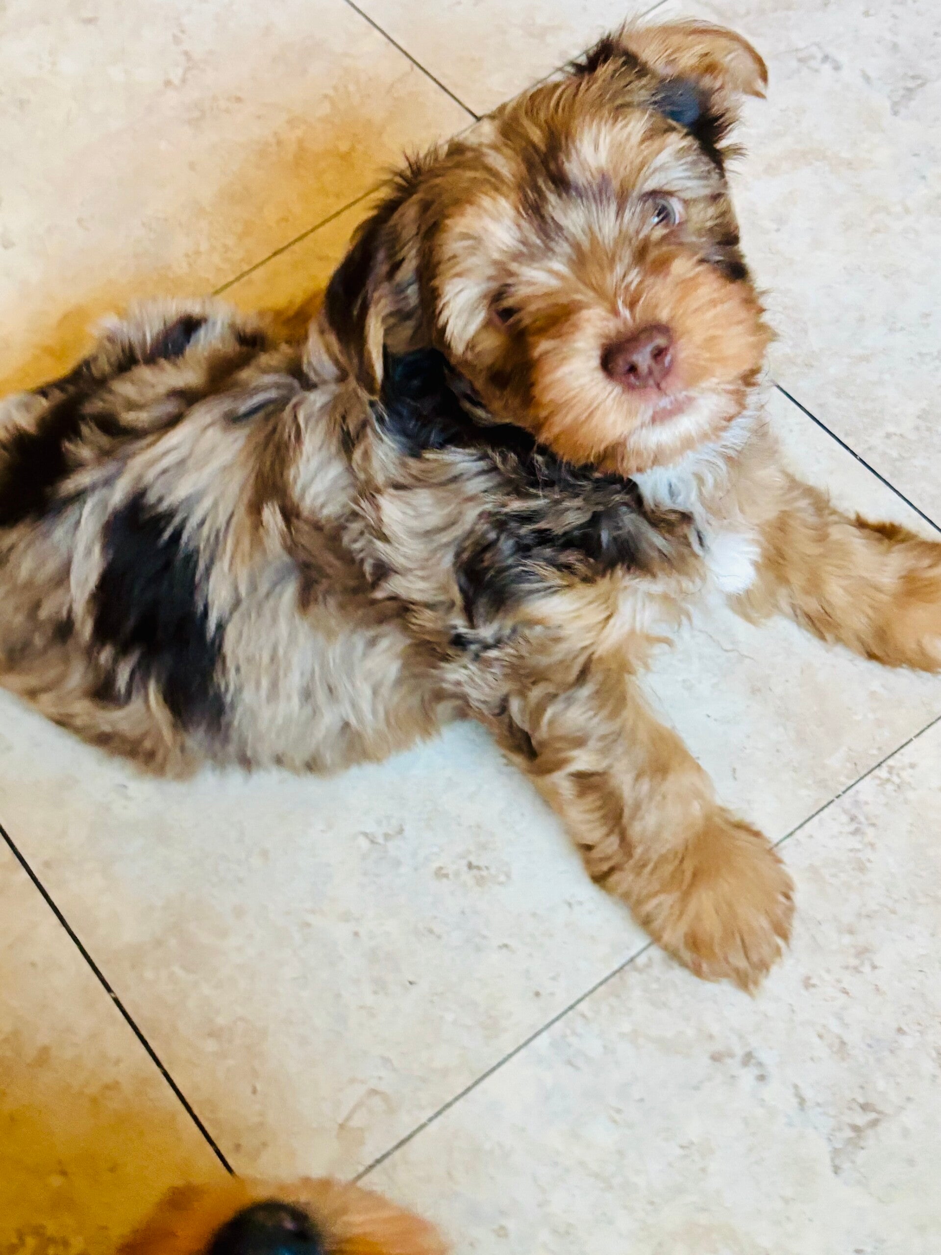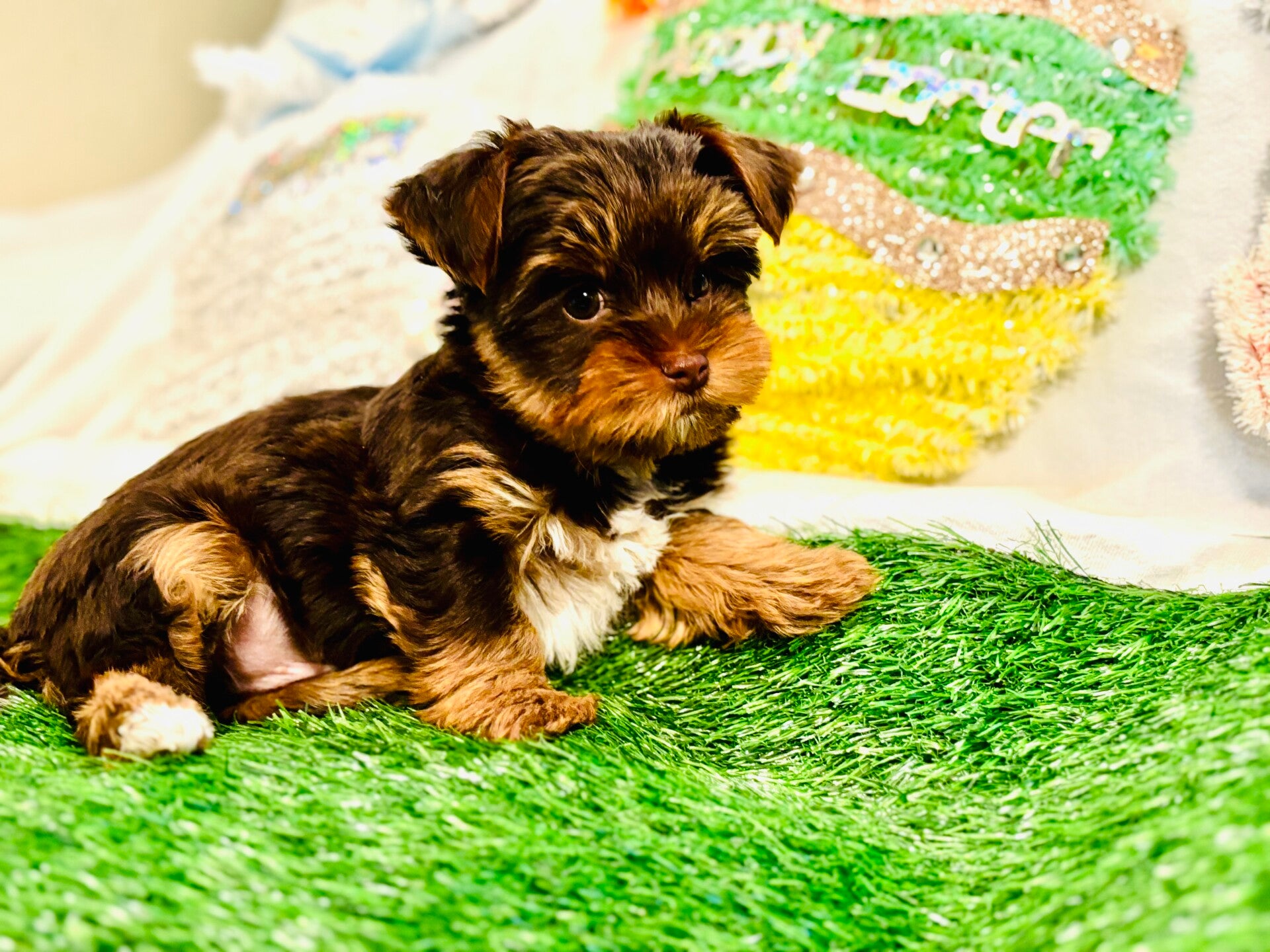 PRINCE- RARE EXOTIC CHOCLATE MERLE (SIRE): 9lbs UNIQUE COLORS light brown (tan), chocolate brown patches, white crest line on head, white chest, hazel eyes. Fluffy Yorkshire terrier with silky hypoallergenic hair. Prince is the perfect little charmer! His playful energy and love for the cuddles make him irresistible companion. plus, his exotic eyes. It so much fun playing fetch with him-he's got the perfect mix of sweetness and spunk!